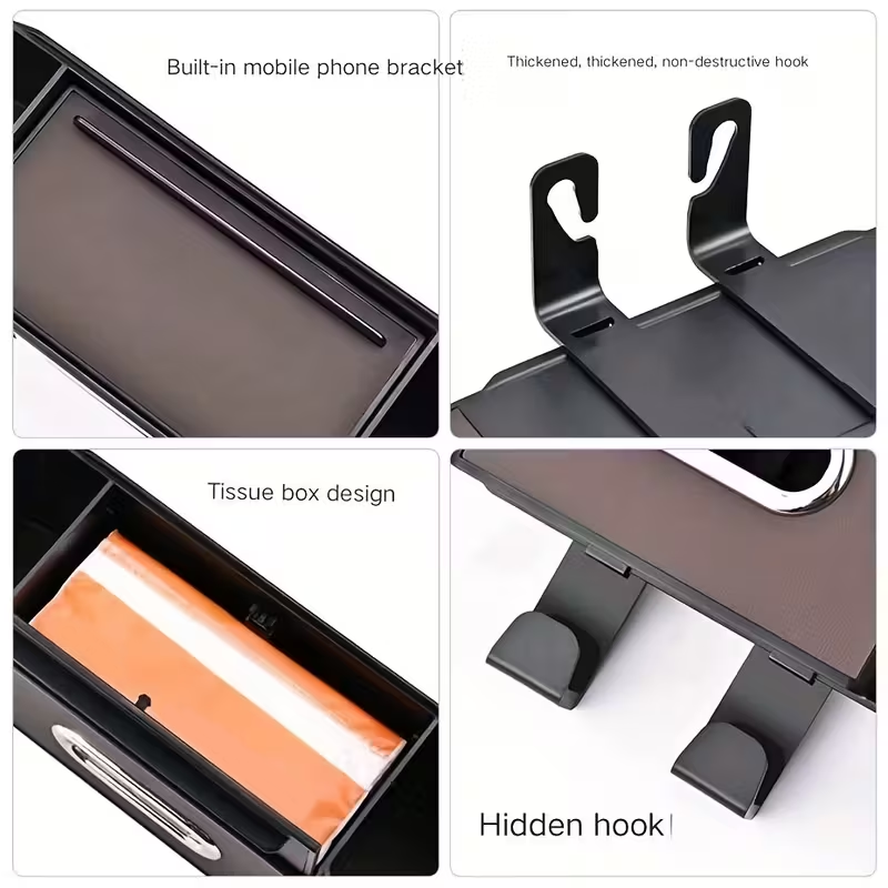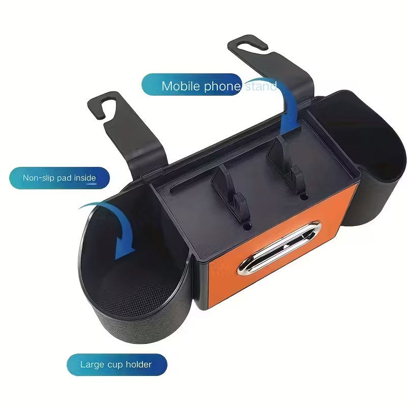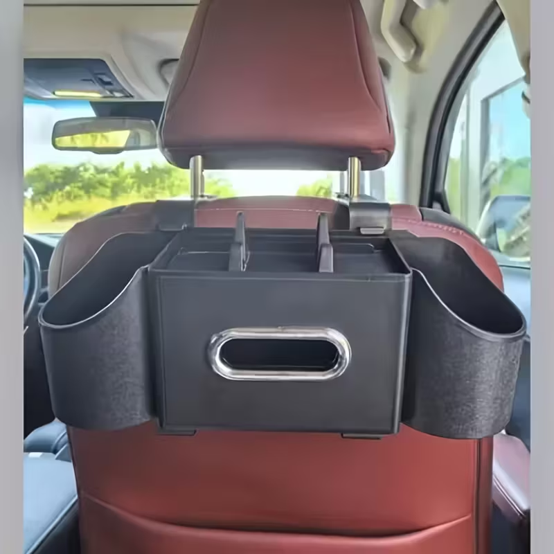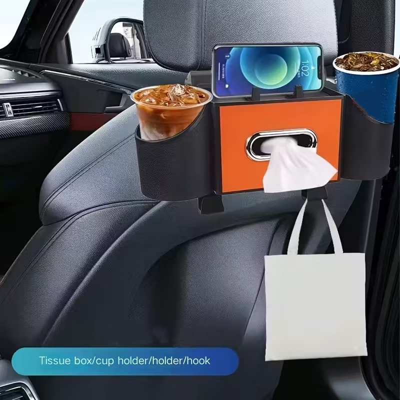 4-IN-1 MULTIFUNCTIONEEL ONTWERP - Houd het interieur van uw auto perfect georganiseerd. Deze unit combineert een tissuehouder, twee bekerhouders, een telefoonhouder en tashaken, zodat al uw essentiële spullen netjes en binnen handbereik van uw passagiers zijn.