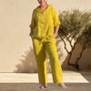 COMFORTABEL KATOEN EN LINEN - Gemaakt van een eersteklas mix van katoen en linnen, biedt dit tweedelige pak de perfecte balans tussen comfort en stijl. Het natuurlijke ademende vermogen van de stof zorgt voor de hele dag door comfort, waardoor het ideaal is voor casual uitjes of lekker thuis loungen.