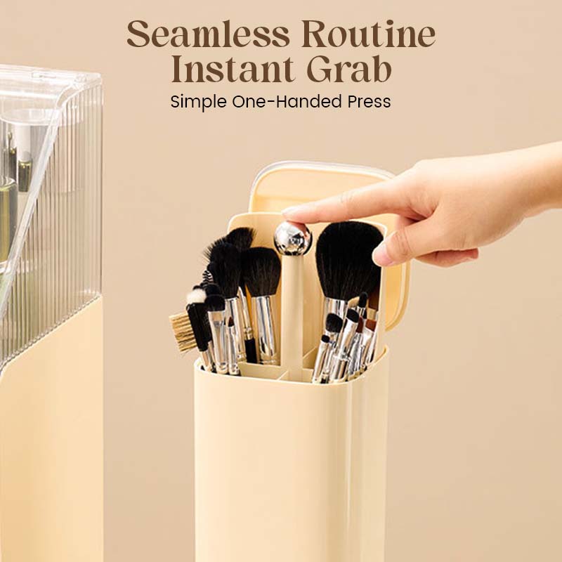 BEDIENING MET ÉÉN HAND - Ontworpen voor ultiem gemak. Het druk-en-open en druk-en-sluit systeem maakt eenvoudige bediening met één hand mogelijk, zodat u makkelijk kwasten kunt pakken of opbergen, zelfs tijdens het aanbrengen van uw make-up.