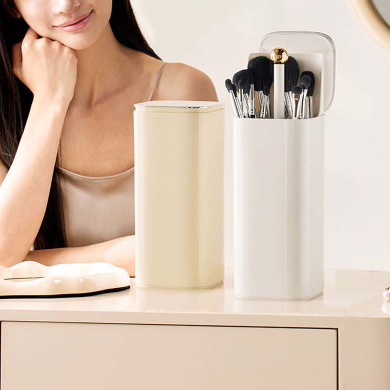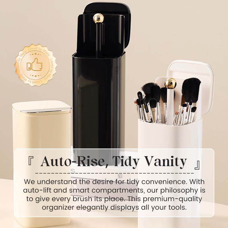 AUTOMATISCH LIFTMECHANISME - Geniet van een vleugje moderne elegantie. Met een simpele druk komt het binnenste compartiment soepel omhoog, waardoor uw kwasten binnen handbereik zijn en een verfijnd ritueel wordt toegevoegd aan uw beautyroutine.