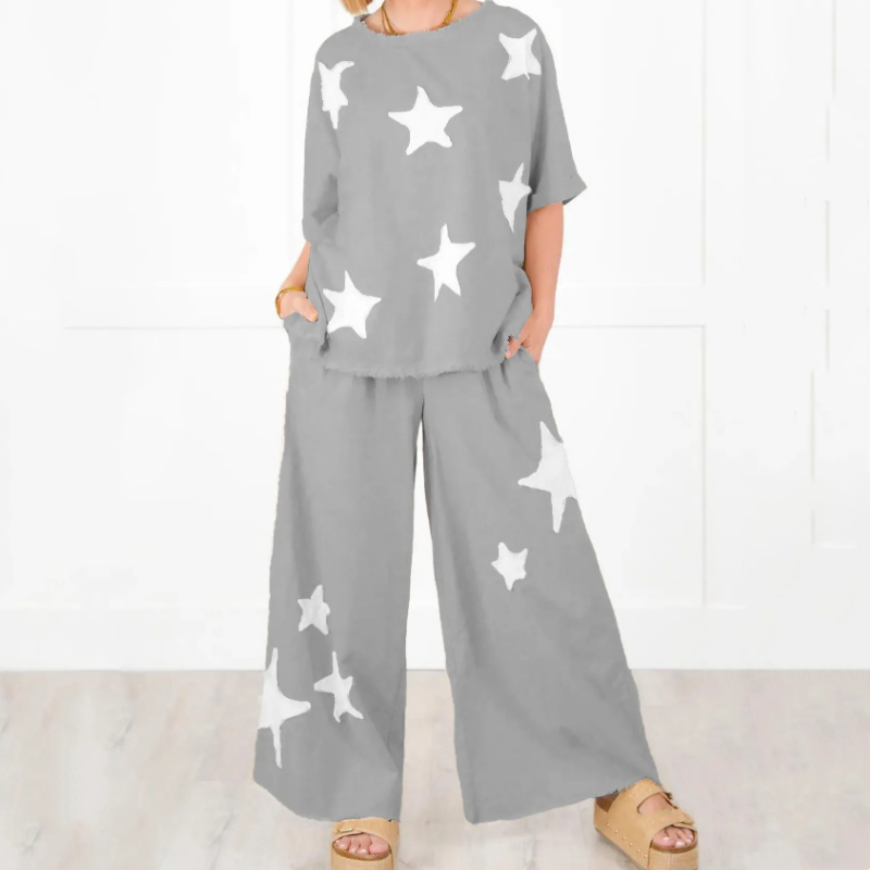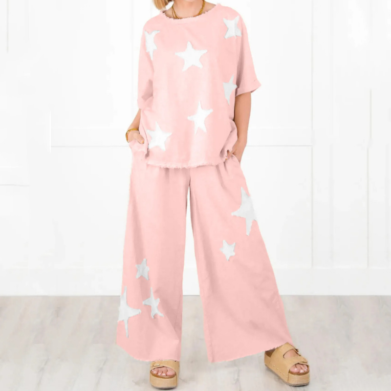 TRENDY DESIGN MET STERPATCH – Met een opvallende sterpatch voegt deze set een stijlvol en speels element toe aan je garderobe. De patch geeft de set een unieke uitstraling en onderscheidt het van typische loungewear.