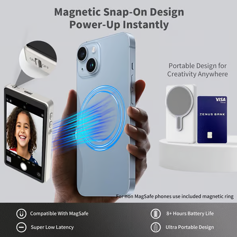 MAGNETIC MOUNT: Features a secure magnetic mount that easily attaches to your phone, enabling hands-free recording and a stable, adjustable viewing angle.