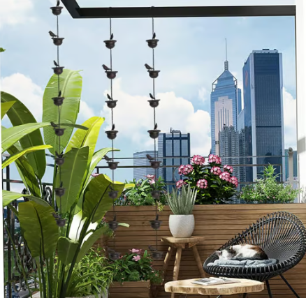 Deze trapsgewijze regenketting is een prachtig alternatief voor traditionele regenpijpen. Het regenwater stroomt gracieus van het ene vogelbad naar het andere en creëert zo een natuurlijk watervaleffect dat zowel visueel als auditief rustgevend is.