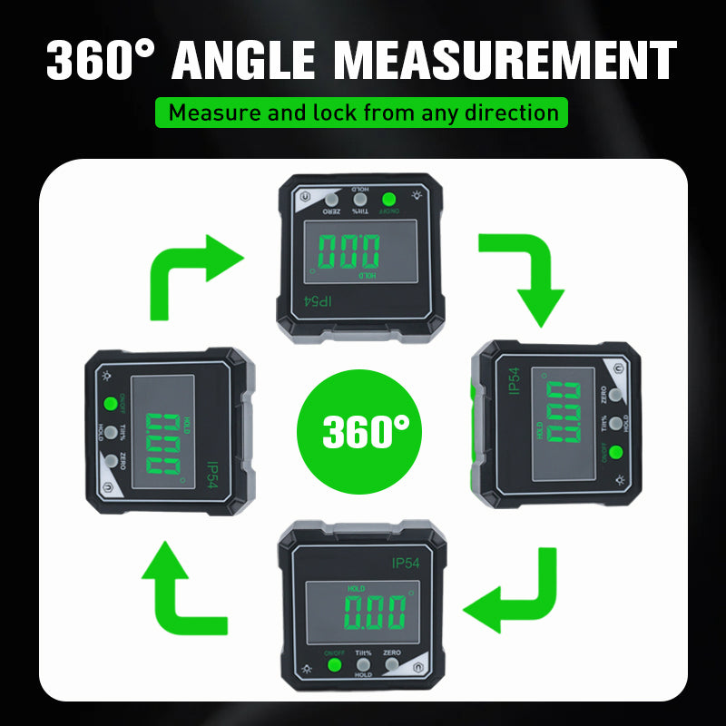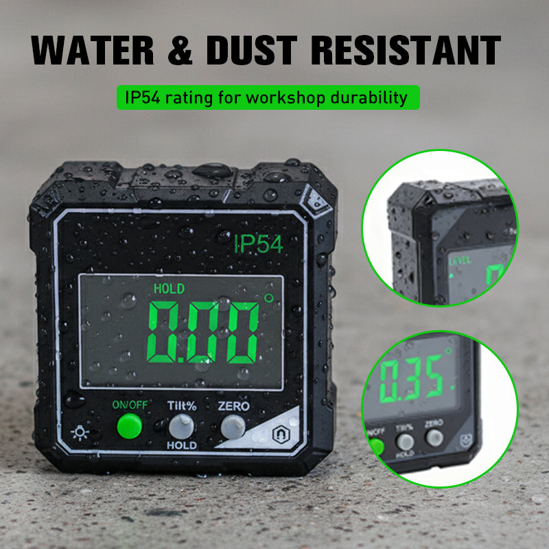 VERBESSERTER UMWELTSCHUTZ : Mit der Schutzart IP54 gegen Wasser und Staub ist dieses WinkelmessgerĂ€t fĂŒr den Umgang mit WerkstattabfĂ€llen und leichter Feuchtigkeit ausgelegt â ideal fĂŒr den Innenbereich oder anspruchsvolle AuĂenbedingungen.