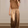 2-DELIG PAK: Het pak bestaat uit een gouden top met ronde hals en korte mouwen en een glanzende broek met hoge taille en wijde pijpen, waardoor je een complete en bijpassende outfit krijgt en je op de hoogte blijft van de laatste modetrends.