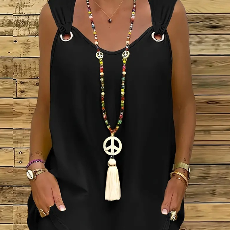 SLANKE MOUWLOZE TOP MET SCHOUDERDETAILS: De mouwloze top heeft een elegante V-hals en opvallende ronde schouderringen voor een moderne uitstraling en stijl. Het ontwerp maakt het gemakkelijk om te schakelen van een casual daglook naar een zomerse avondoutfit, en biedt veelzijdigheid met een modieuze twist.